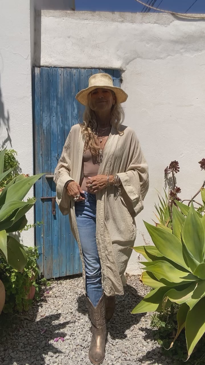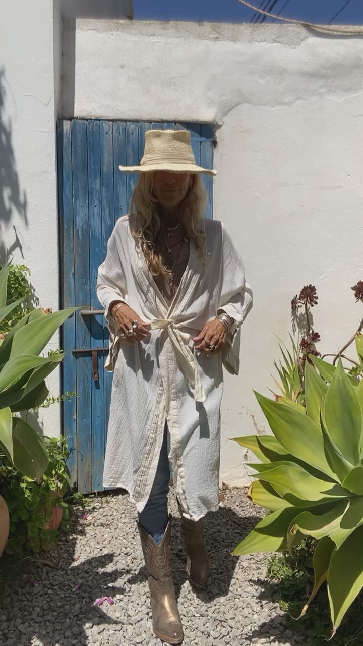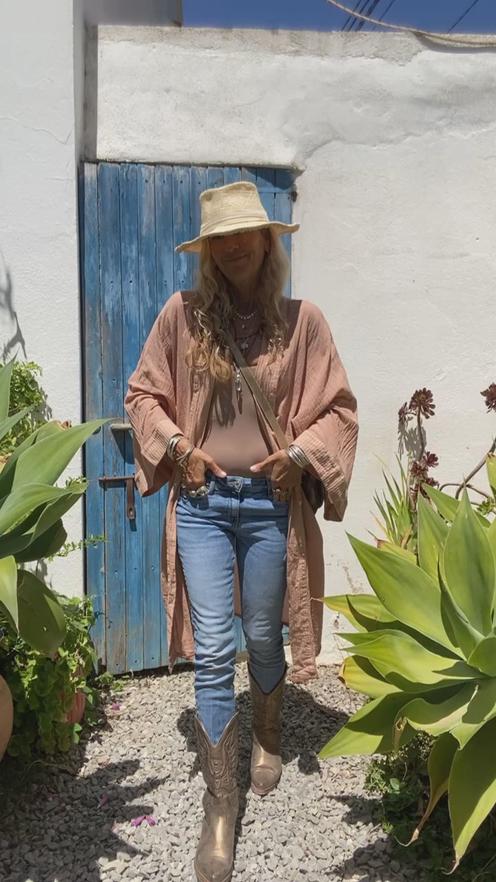 Kimono de 100% Algodon.Teñido a Mano con tintes Ecológicos.El Bordado está Hecho a Mano,por nuestro equipo de Bordadoras.Tanto los puños como todo el contorno tiene dos capas de algodón,que hacen que la prenda tenga más cuerpo.El trabajo del Bordado es un Auténtica Maravilla!!